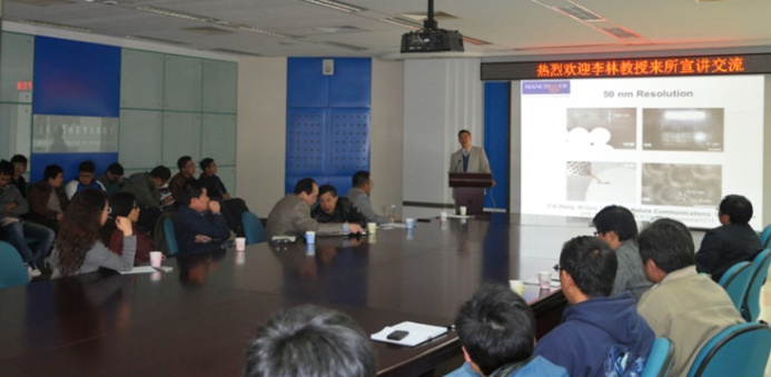 在应用光学国家重点实验室,李教授做了题目分别为“Super-resolution Imaging with Microsphere Nanoscopy”和“The Interface and Crossover between Laser Macro and Micro/Nano Fabrication”的两个报告,并与在场科研人员展开讨论。随后,李教授与应用光学国家重点实验室黄玮主任,吴一辉副主任就科研合作进行深入探讨。