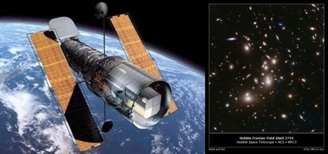 哈勃望远镜(左)及其拍摄的宇宙图像(右)
