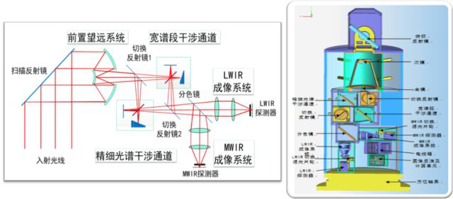 图15 全景双谱段红外成像光谱干涉测量仪器光路与三维结构图(图片来源:课题组)