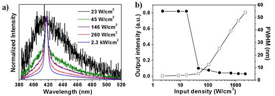 图2 联1,3,4-噁二唑衍生物微米单晶纤维有机薄膜(a)随泵浦强度变化的受激发射光谱和(b)受激发射峰强度、半宽随泵浦强度变化的曲线。