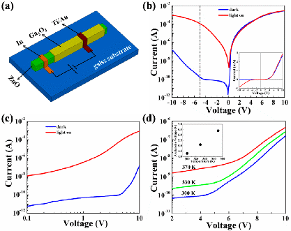 氧化锌/氧化镓核壳结构微米线采用一步CVD生长法制备。这种方法所生长的核壳结构微米线,核层氧化锌和壳层氧化镓都是高晶体质量的单晶,并且两种材料的界面非常陡峭,无明显界面缺陷和位错的存在。通过在核层与核层分别制备金属电极,就构成了异质结结构的日盲紫外探测器件。器件的响应峰值在254 nm,响应截至边266nm,对日盲紫外光具有高灵敏度、高探测度、高量子效率和高速的响应。在-6 V的电压驱动下,器件的明暗电流比可以达到106以上,响应度可达到1.3×103 A/W, 探测率为9.91×1014 cm·Hz1/2/W,响应时间小于20 μs,该结果为目前同类器件当中性能最好的结果,其主要性能高于目前商业Si雪崩二极管。通过对器件的性能进行了深入的研究,发现器件具有雪崩增益,其增益高达104。