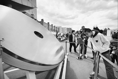 图为当日市民在长春光机所参观展出的直径两米单体碳化硅反射镜坯,它是航空、航天相机或地基望远镜的反射镜材料。