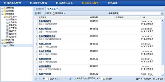 通过访问ARP系统信息管理与服务平台,允许用户查看在本单位ARP系统当中与本人有关的人员、课题、财务、资产和知识产权等相关信息。可对个人信息进行快速查询,其中包括基本信息、学历信息、课题经费信息、工资信息、欠款信息等等。