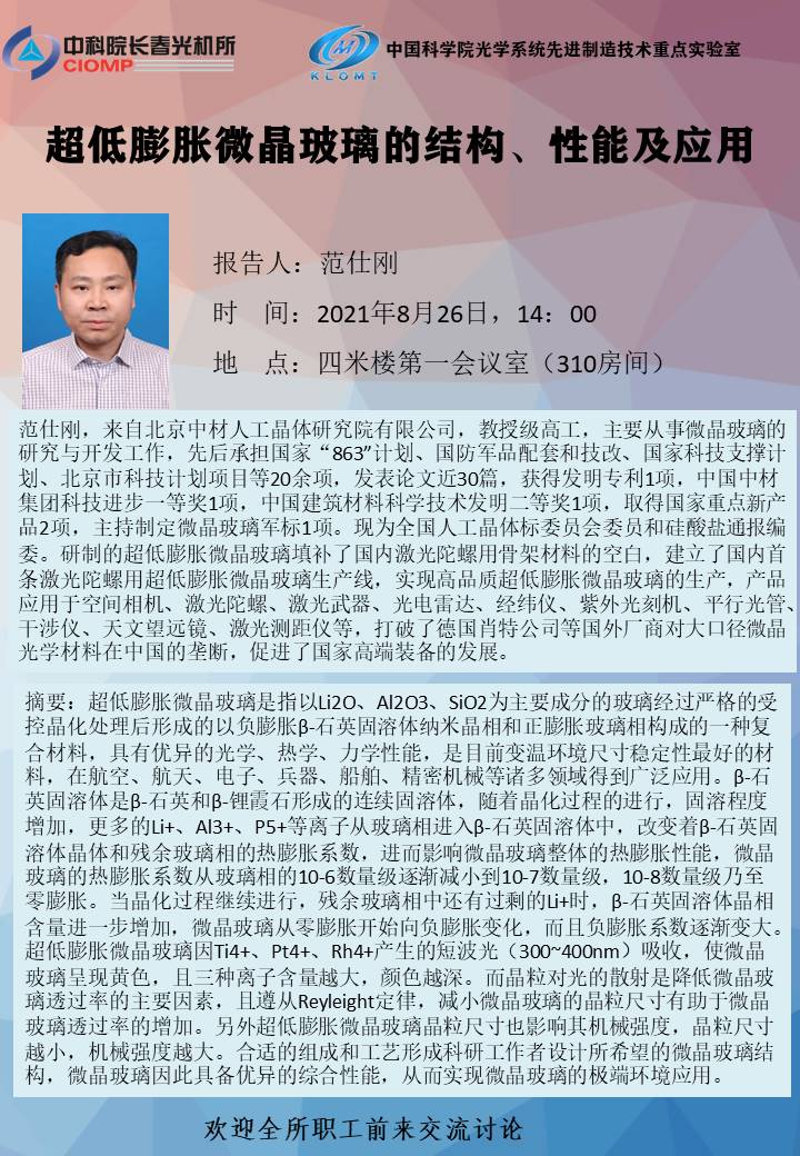 报告人简介:范仕刚,来自北京中材人工晶体研究院有限公司,教授级高工,主要从事微晶玻璃的研究与开发工作,先后承担国家“863”计划、国防军品配套和技改、国家科技支撑计划、北京市科技计划项目等20余项,发表论文近30篇,获得发明专利1项,中国中材集团科技进步一等奖1项,中国建筑材料科学技术发明二等奖1项,取得国家重点新产品2项,主持制定微晶玻璃军标1项。现为全国人工晶体标委员会委员和硅酸盐通报编委。研制的超低膨胀微晶玻璃填补了国内激光陀螺用骨架材料的空白,建立了国内首条激光陀螺用超低膨胀微晶玻璃生产线,实现高品质超低膨胀微晶玻璃的生产,产品应用于空间相机、激光陀螺、激光武器、光电雷达、经纬仪、紫外光刻机、平行光管、干涉仪、天文望远镜、激光测距仪等,打破了德国肖特公司等国外厂商对大口径微晶光学材料在中国的垄断,促进了国家高端装备的发展。