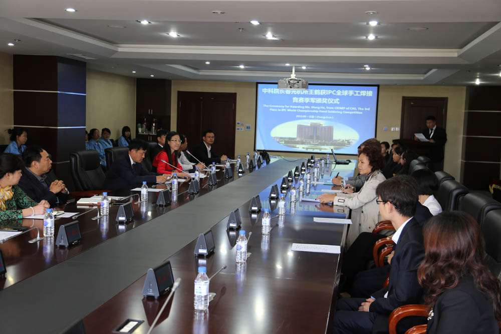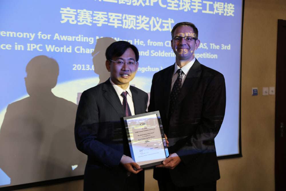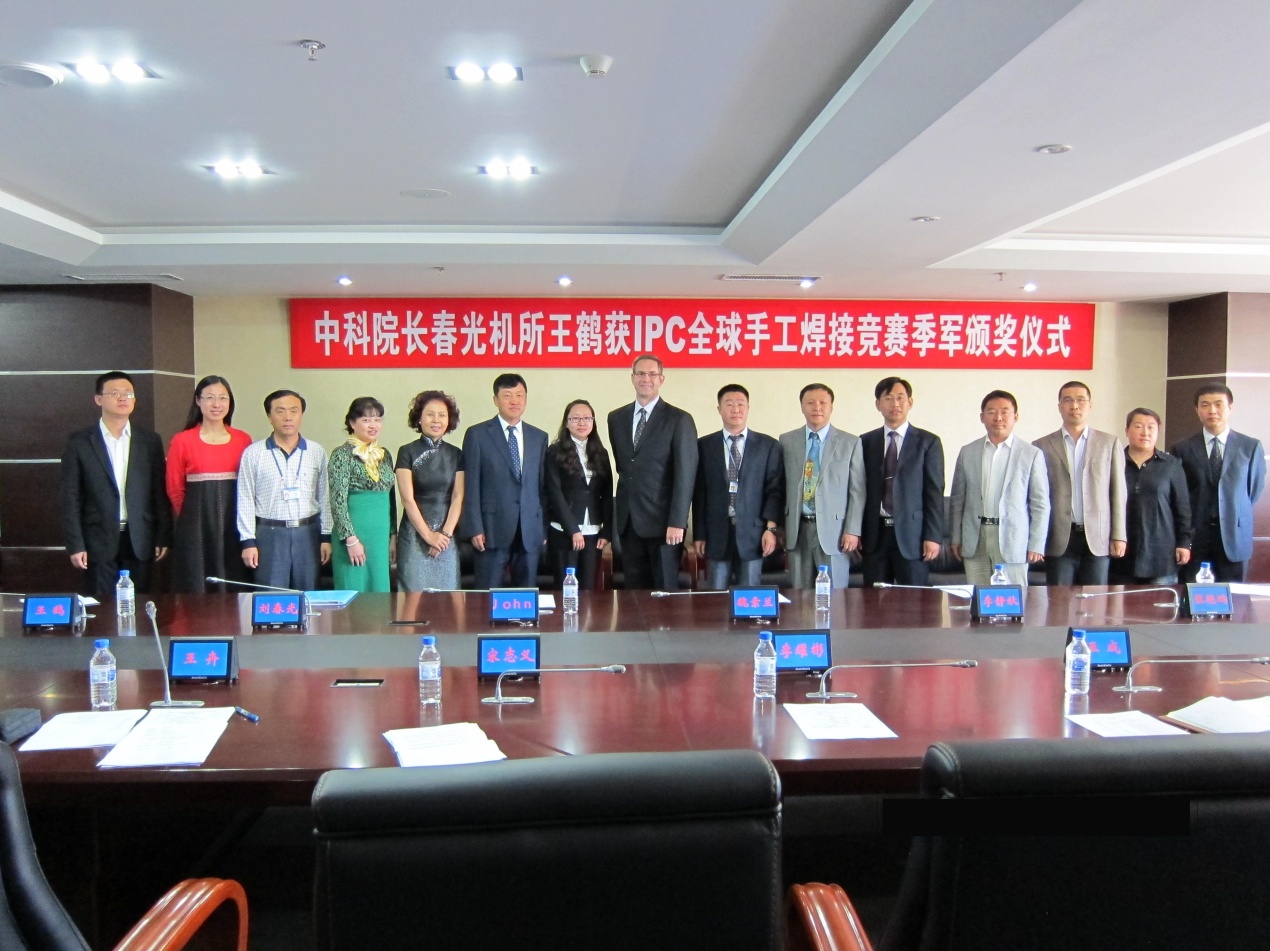 9月11日上午九点,国际电子工业联接协会(IPC)总裁John Mitchell一行专程来到长春光机所,为日前夺得IPC全球手工焊接竞赛季军的电装工艺中心员工王鹤颁奖。