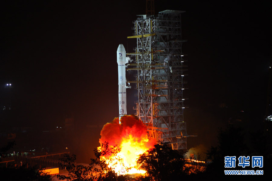12月2日01时30分,搭载着我国嫦娥三号探测器的长征三号乙改进型运载火箭按照预定程序在西昌卫星发射中心二号塔架点火起飞。新华社记者张宝印