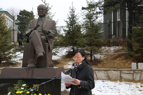 仪式最后,长春光机所综合办副主任王晓慧发表讲话。讲话回顾了王大珩先生为祖国的科学事业鞠躬尽瘁,无私奉献的一生,表达了长春光机所全体职工及学生对王老的怀念和敬意之情,感谢先生作为长春光机所的缔造者、首任所长为长春光机所的发展奠定的坚实基础,更希望大珩先生渊博的学问、深邃的思想、卓越的见识、宽广的胸襟、务实的精神和儒雅谦和的作风能够深深地感染着每个长光人,同时希望新一代的长春光机所广大科技工作者和青年学子们能够在王大珩先生不朽精神与光辉业迹的感召下,秉承“尽瘁报国、博大精专、求实创新、虚怀若谷”的高尚精神,甘于奉献、开拓创新、奋力前行,为长春光机所的新一轮改革发展、为祖国的繁荣富强,做出积极的贡献。