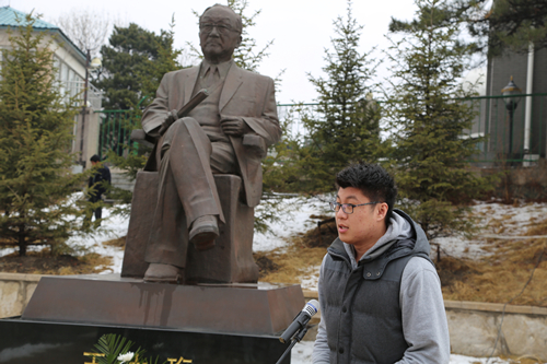 在大珩铜像前,首先由长春光机所研究生会副主席刘勇代表青年学生做倡议发言,号召广大青年学生继承并发扬大珩先生先天下之忧而忧的责任感,虚怀若谷、包容百家的坦荡胸襟,严肃认真、一丝不苟的工作态度,以及艰苦朴素、淡泊名利、律己至严、待人至善的高风亮节,脚踏实地、刻苦钻研、无私奉献,为国家的发展、民族的振兴贡献出青年学子应有的力量。