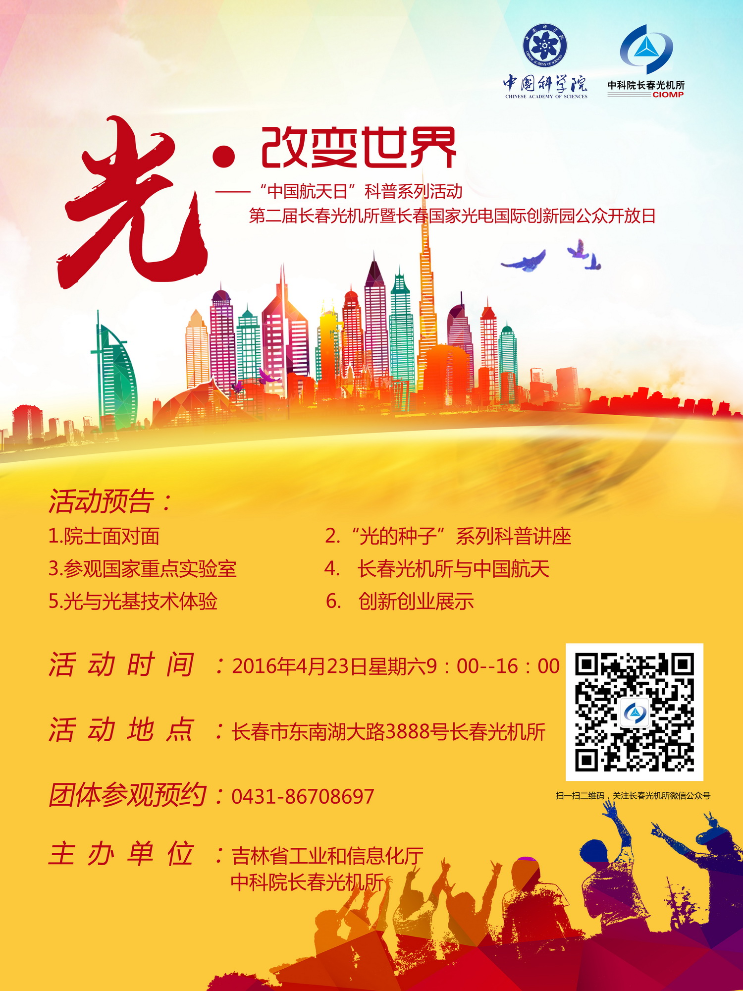 本次活动以科技创新、追梦未来”为主题,设立中科院院士专题讲座,与公众互动;“光的种子”系列科普讲座,体验不一样的科技;国家重点实验室参观、光与光基科技体验、航天科研成果展、创新创业成果展等内容,奖品多多,惊喜满满,敬请期待!
