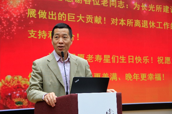 马明亚书记在祝寿会上致辞,他首先代表所党政领导班子及全所职工向在座的寿星老同志们致以诚挚的生日祝福,衷心感谢各位老同志为长光所建设和发展做出的巨大贡献,以及对本所离退休工作的理解、支持和配合,并祝愿全所老同志身体更健康、生活更美满、晚年更幸福!随后,他通报了本所近五年来科研、人才队伍建设、成果转化与产业化、研究生教育及离退休管理与服务等工作的进展情况。
