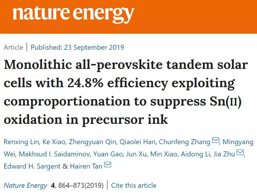 2019年9月,国际顶级能源类期刊《Nature Energy》发表了来自于南京大学最新研究成果,现代工程与应用科学学院谭海仁教授课题组联合朱嘉教授、李爱东教授、物理学院张春峰教授,利用不同带隙的钙钛矿实现了高效率的全钙钛矿叠层太阳能电池,经第三方检测机构认证转换效率高达24.8%,为目前世界记录效率。