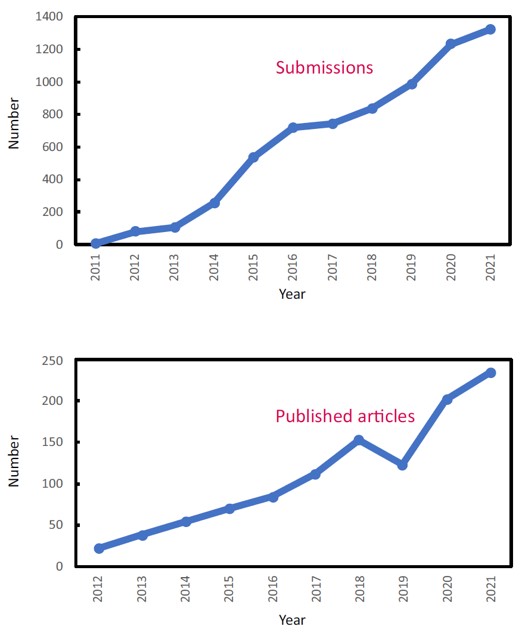 过去的十年中,Light发表了来自58个国家/地区1070个机构的1000多篇论文。收稿量(从2012年的80篇到2021年的1300余篇)和发文量(从2012年的22篇到2021年的234篇)都有快速增长。清楚地反映出来自全球顶级光学光电子学研发机构的科学家们给了Light信任与支持。