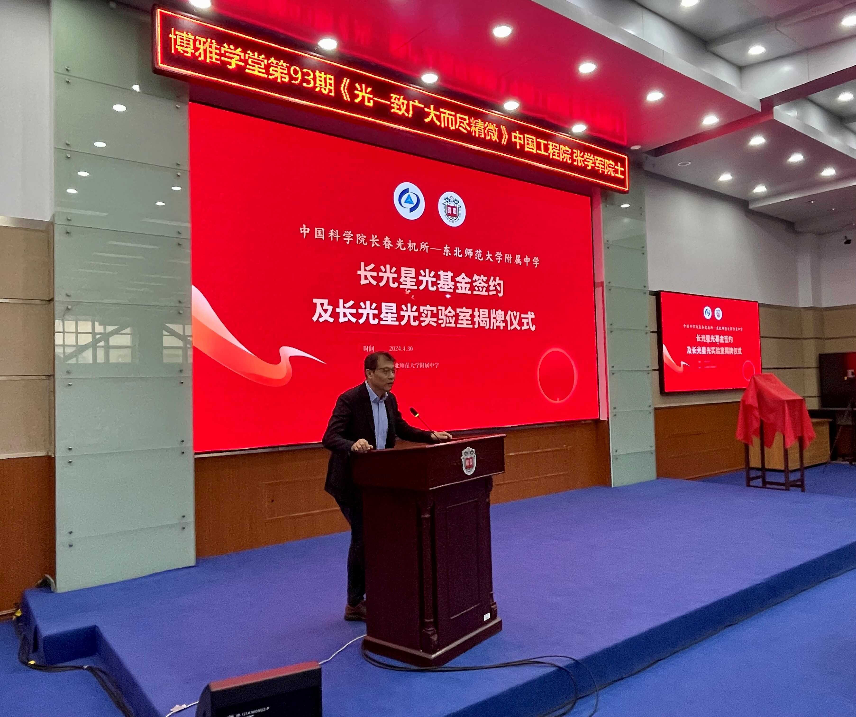 4月30日,中国科学院长春光机所与东北师范大学附属中学签约授牌仪式暨院士报告活动在东北师范大学附属中学报告厅成功举办。东北师范大学校长、党委副书记徐海阳,东北师范大学附属中学校长、党委副书记邵志豪出席并致辞,中国工程院院士、中国科学院长春光机所所长张学军讲话并作报告,中国科学院长春光机所党委副书记、纪委书记孙焕,副所长孙守红以及东北师范大学附属中学400余位师生出席本次活动,活动由东北师范大学附属中学党委书记刘丽君主持。