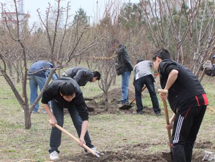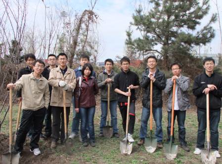 上午八点半,研究生部门口已经聚集了近80名学生,在团总支几位负责人的组织带领下,植树活动拉开序幕。同学们三或五人一组,很快在草地上就完成了十几个半米左右的土坑。春天里独特的泥土气息,充斥着每一个人的心扉,一滴滴晶莹的汗水在每一个植树者的脸上划过,淡淡的笑容却始终印在谈们的脸上。很多草皮下面的不深处,都藏着大量的碎石和建筑垃圾,这给刨坑带来了不小的困难,但同时也给同学们带来了另一番兴致,一个个像挖宝贝似的,到处充斥着铁锹和石块碰撞的乐章。下午,同学们又在研发大厦两侧,为即将‘安家落户‘的小树布置好了栖息之所。