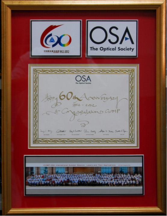 2012年迎来了中科院长春光学精密机械与物理研究所(长春光机所)成立60周年华诞。9月17日-18日,长春光机所召开了Photonics Trend 2012国际会议,200多位国内外学术界和企业界代表参会。美国光学学会派出包括现任主席、美国哥伦比亚大学Tony Heinz教授,2010年主席美国亚利桑那大学James Wyant教授,2007年主席美国罗切斯特大学Joseph Eberly教授,2013年主席、加拿大滑铁卢大学Donna Strickland教授,主任会员、美国亚利桑那大学Thomas Koch教授,主任会员、韩国首尔国立大学Byoungho Lee教授,首席执行官Elizabeth A. Rogan女士,国际部主任Kristin Mirabal,发行人Kelly Cohen等一行9人的顶级阵容出席了此次国际会议,借此机会向长春光机所表示祝贺,并赠送其专门为长春光机所建所60周年特制贺礼。