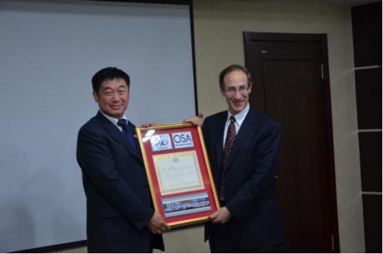 美国光学学会现任主席Tony Heinz(右)向长春光机所所长宣明(左)赠送贺礼