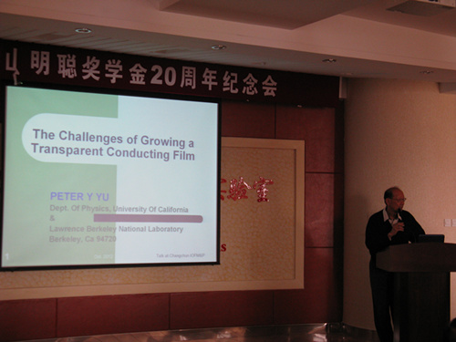 在所期间,Peter Yu教授针对半导体物理以及相关领域,作了题目为“The Challenges of Growing a Transparent Conducting Film”的报告,围绕在太阳能电池、LED等器件需求广泛的透明导电薄膜制备,尤其是通过控制半导体材料掺杂获得高电导率、高质量的透明导电薄膜进行了阐述。
