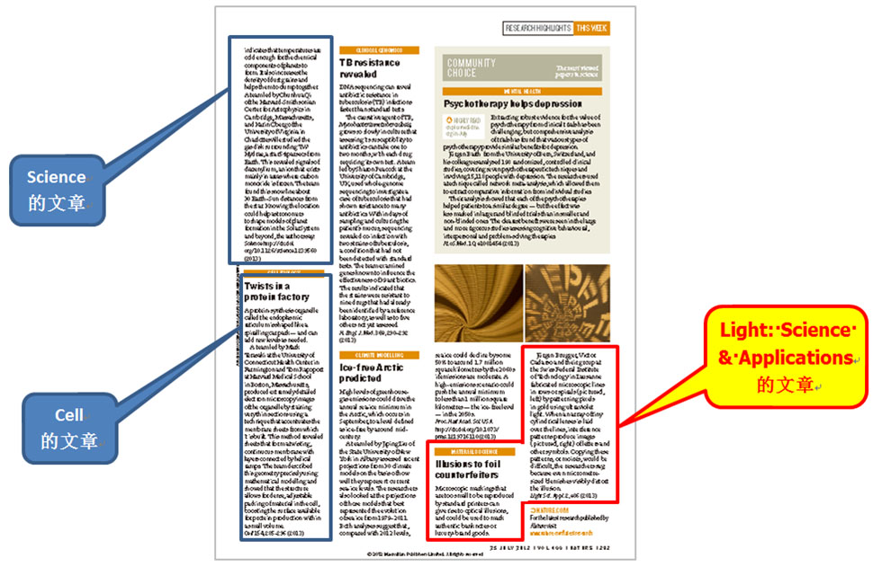 在最新出版的一期Nature期刊(2013年,499卷,7459期)中,长春光机所主办的英文国际期刊 Light: Science & Applications 发表的论文“High-resolution 1D moirés as counterfeit security features”入选其Highlight栏目。该栏目还同时介绍了Science, Cell等期刊上发表的论文。