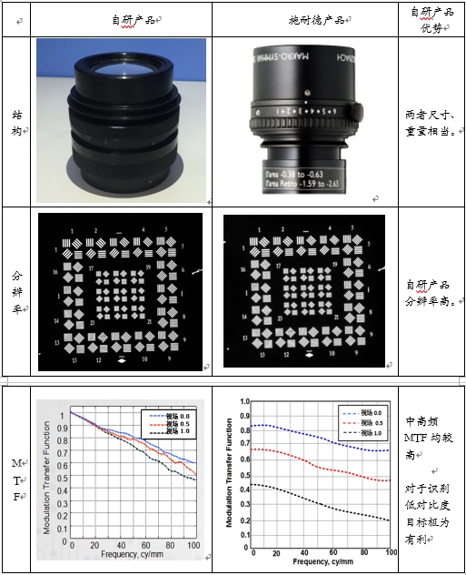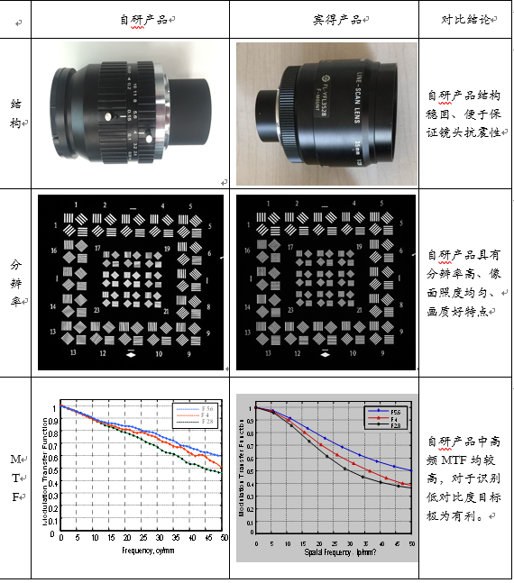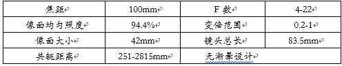 其次,研究团队完成了100mmPCB检测镜头的开发。该产品通过物象距离的改变实现放大倍率的改变。为了保证成像质量,该款镜头从设计到加工装调都需要具有良好的质量控制,在光学设计方面,采用变形的复杂化的高斯光学结构,通过镜片材料、镜片合理加减和面型参数的优化控制,获得了一款公差相对较为宽松的、高成像质量的光学系统在镜片加工过程中镜片面型和胶合质量进行了严格筛选。在镜头装调过程中采用定心车装调方式,保证了镜头的装调精度。表2、表3分别为100mmPCB检测镜头的技术指标、自研发产品与标杆产品的对比表。