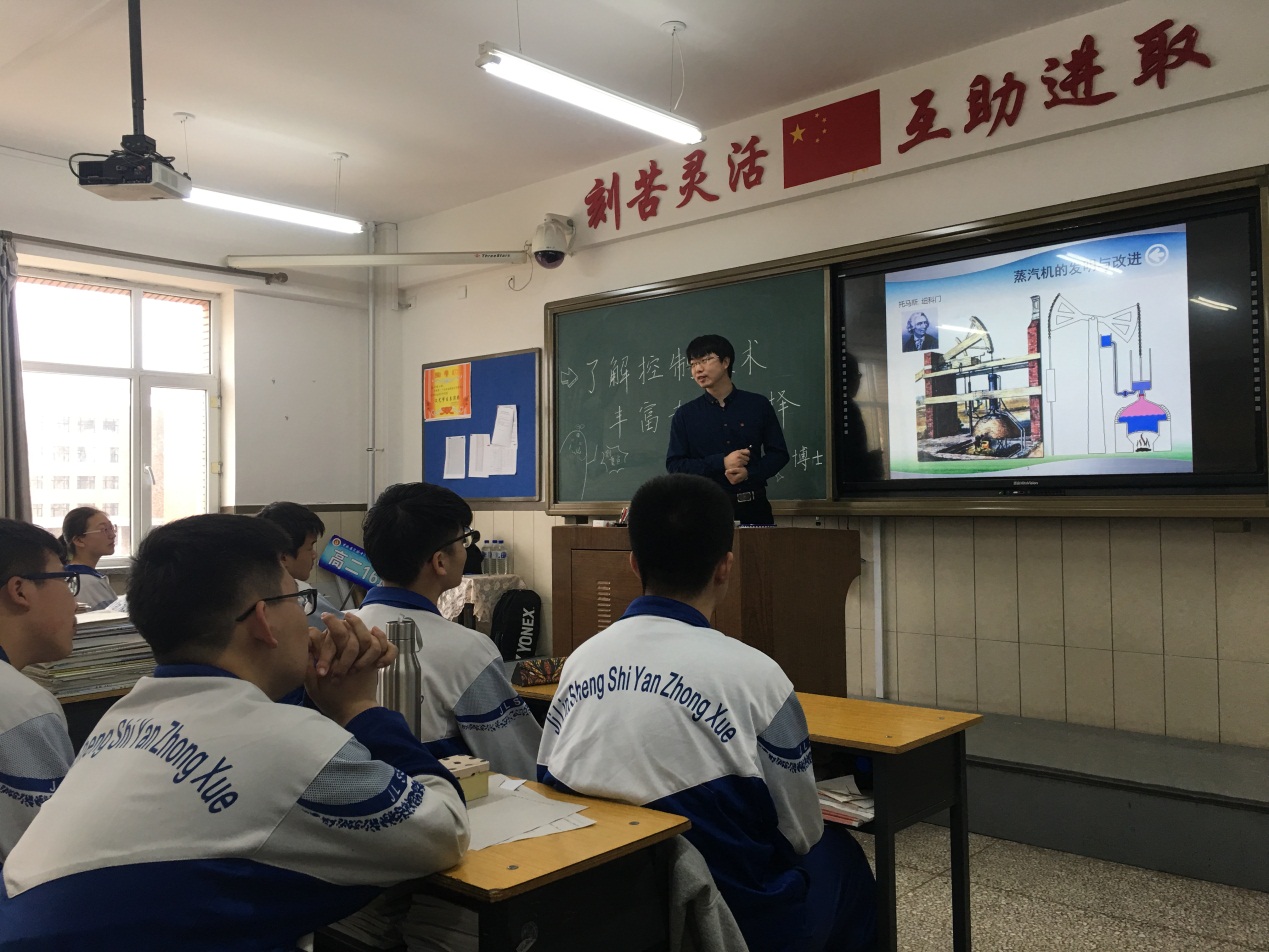 4月18日下午,长光所国际合作处王卉、航测三部运动控制与补偿学科组长田大鹏副研究员来到吉林省实验中学为高二同学做了题目为《了解控制技术,丰富专业选择》的科普讲座。田大鹏副研究员从第一次工业革命讲起,运用生活中的例子介绍控制科学的起源于发展;围绕神州11号与天宫2号的发射过程、对接过程,为同学们讲解火箭是如何稳定飞行并按预期轨迹运行、飞船是如何进行对接、空间飞行器如何在地面进行仿真控制等等内容。田大鹏副研究员还采用单级旋转倒立摆装置现场为同学们现场演示了倒立摆的稳定控制、圆周运动控制并进行了问答与互动。