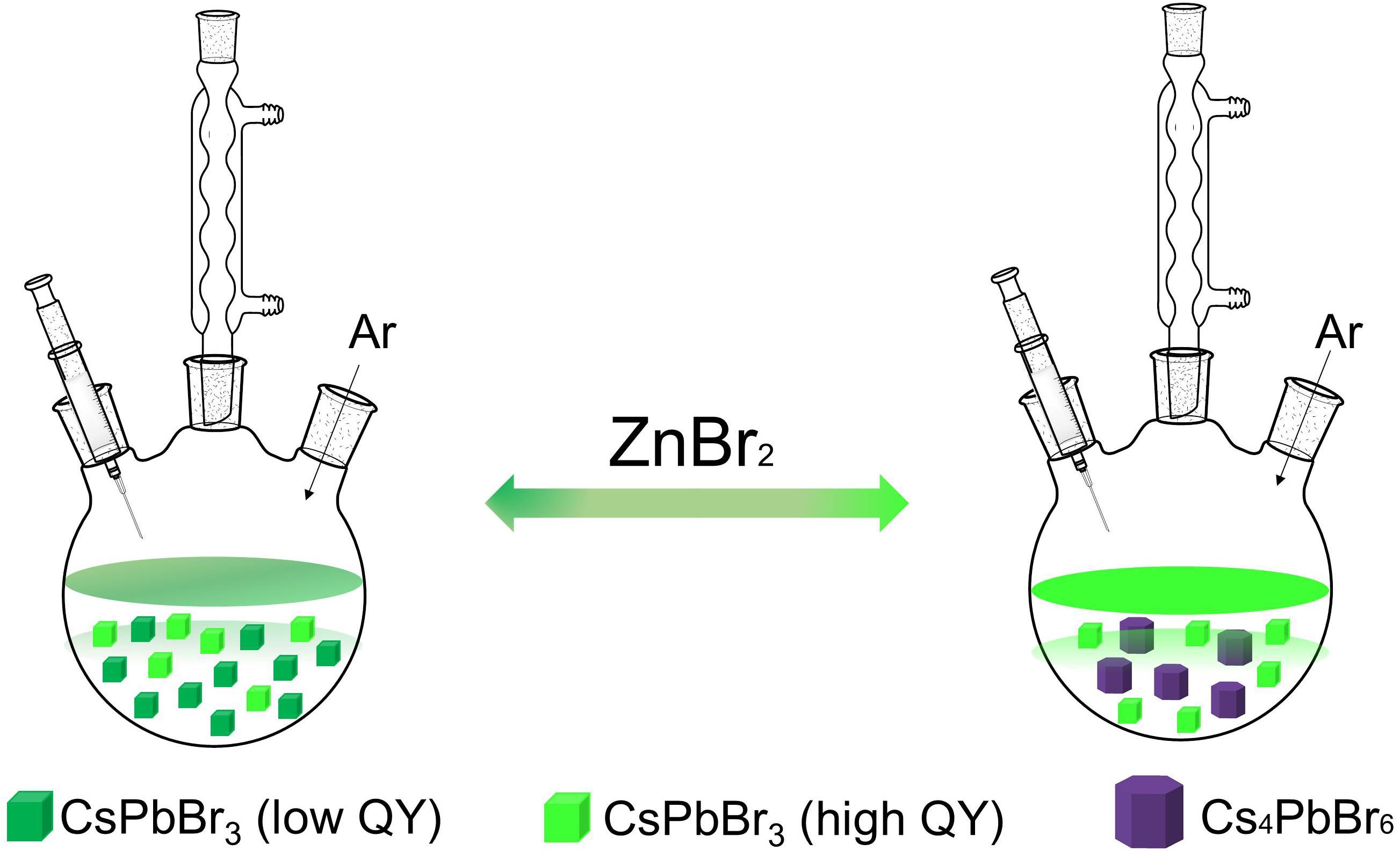 曾庆辉等科研人员通过添加ZnBr2作为诱导剂,实现了由CsPbBr3量子点向Cs4PbBr6纳米晶转化,并解释了在这种转化过程中存在的明显的荧光增强作用(CsPbBr3量子点的荧光量子产率由58%提高到99%)及其背后的深层机制。同时,察到Cs4PbBr6纳米晶的精准的发光峰位置(336nm),解决了之前存在的争议问题。