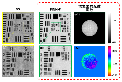 为了解决该问题,长春光机所应用光学国家重点实验室液晶光学课题组提出了基于神经网络结构的恢复算法(FINN-P),并将光瞳函数的恢复过程嵌入其中。该算法可以正确的恢复出系统的光瞳函数并以此对高分辨率图进行重建,提升了算法的鲁棒性,降低了光源的相干性以及系统像差对重建结果带来的影响,并成功地解决了传统算法在视场边缘处会出现收敛错误的问题。对分辨率板和实际生物样本图片使用该算法处理后,图像质量有了明显提高。课题组孙铭璐、李大禹、穆全全等将相关结果以“Neural network model combined with pupil recovery for Fourier ptychographic microscopy”为题发表在Opt. Express, 2019年, 27卷, 17期, 24161-24174(DOI: https://doi.org/10.1364/OE.27.024161)上。