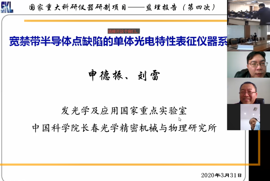 3月31日,由中科院长春光机所牵头承担的国家自然科学基金委国家重大科研仪器研制项目“宽禁带半导体点缺陷的单体光电特性表征仪器系统”项目监理会在中科院长春光机所召开,在新冠肺炎疫情特殊情况下,本次会议以视频会议的形式召开。