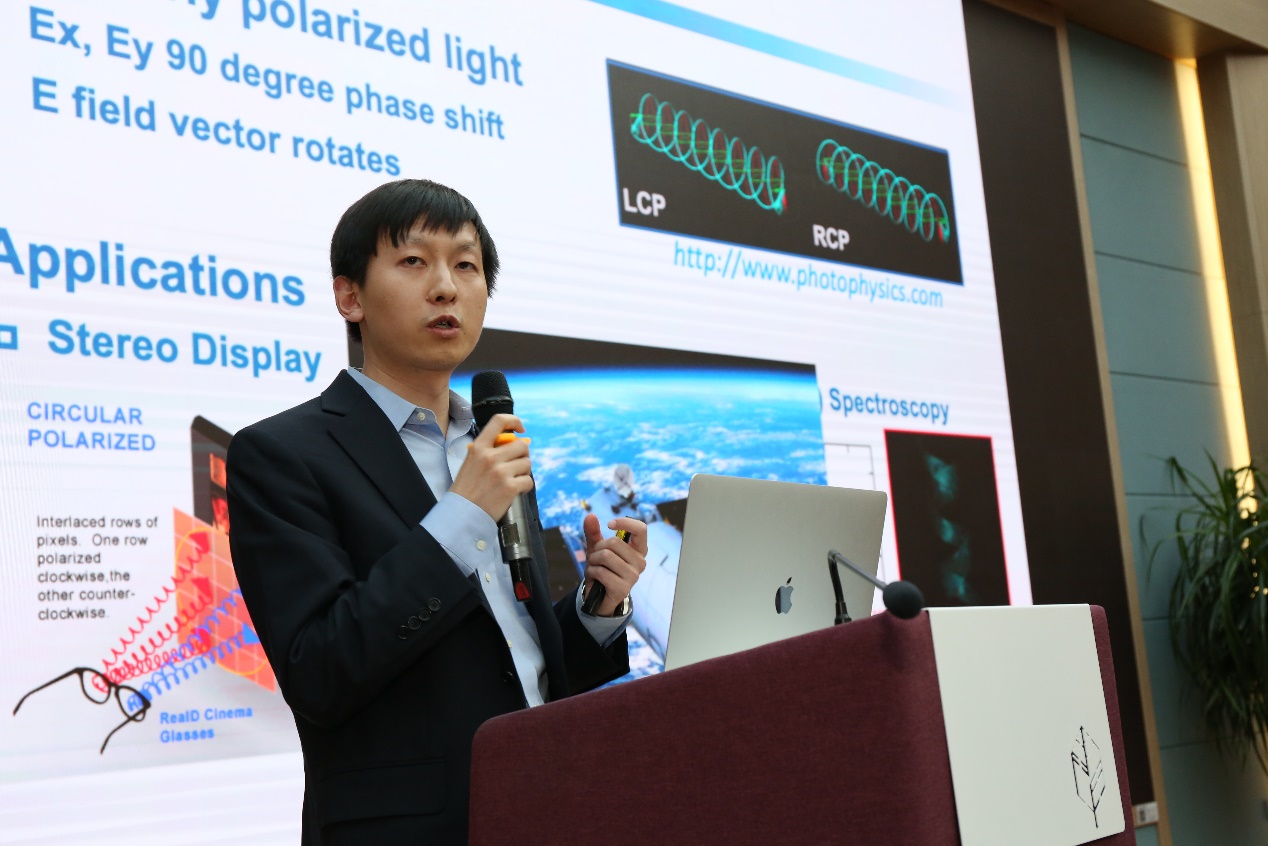 李炜主要从事微纳光子学与热辐射的相关研究,他做了题为“从超表面到热辐射调控”的报告,简要介绍了通过微纳光学结构,如何实现手性超表面对圆偏振光的调控以及其在集成化圆偏振光探测器上的潜在应用;并介绍了热辐射调控以及其在日间辐射制冷,夜间发电等能源领域的潜在应用。