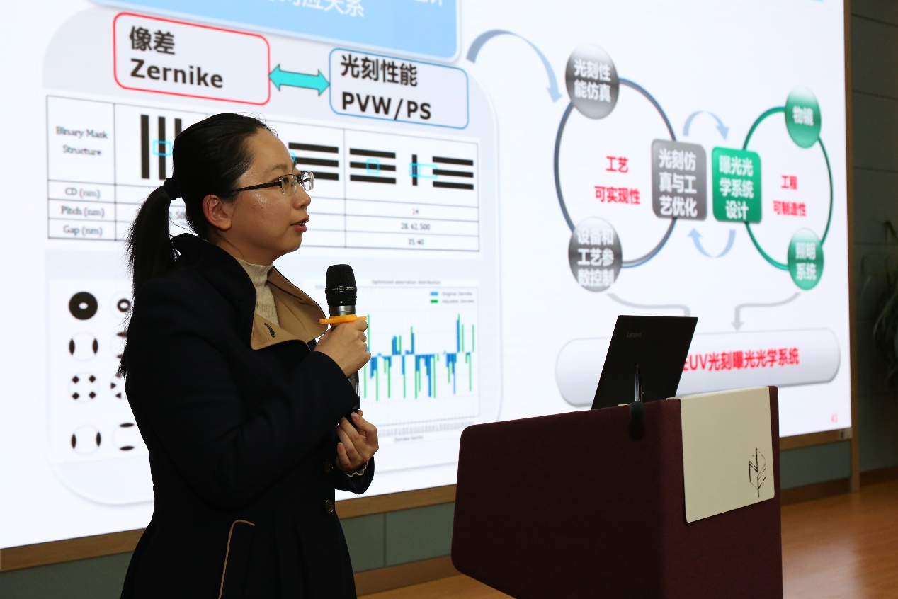 王丽萍主要从事极紫外光刻光学技术研究,她做了题为“极紫外光刻曝光光学系统协同设计”的报告,简要地介绍了EUV光刻曝光光学系统的发展历程及面临的技术挑战,重点介绍了EUV光刻曝光光学系统协同设计方法。