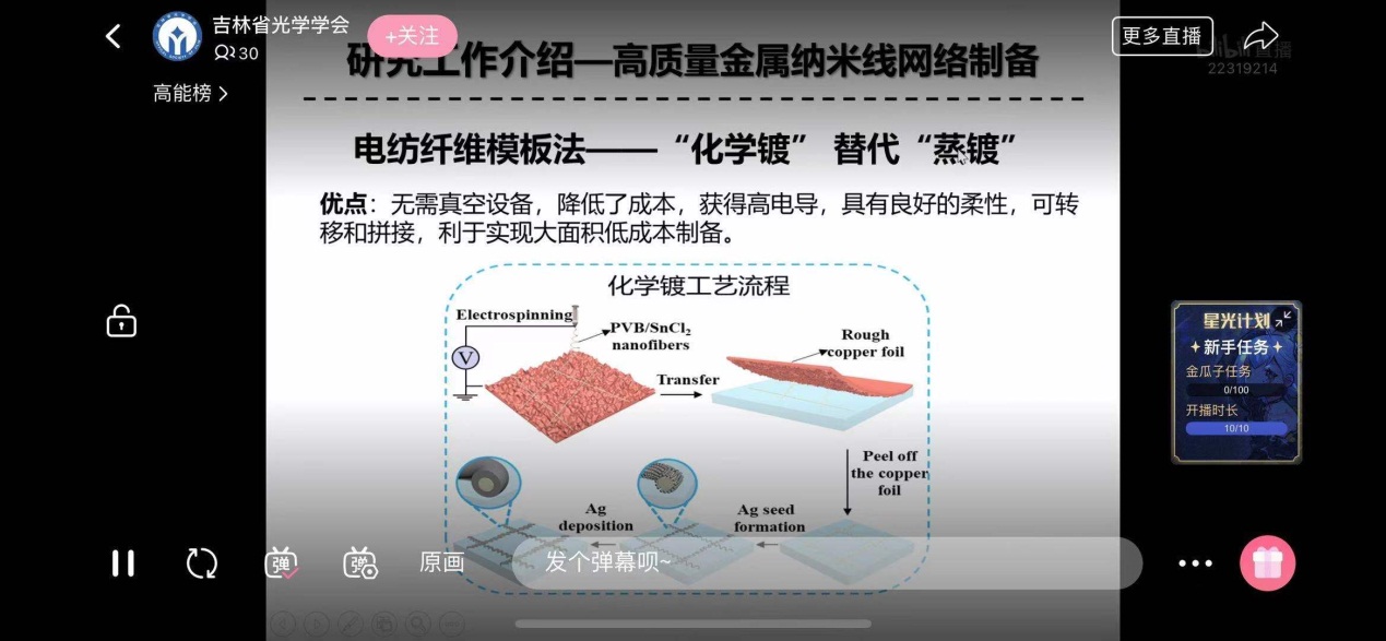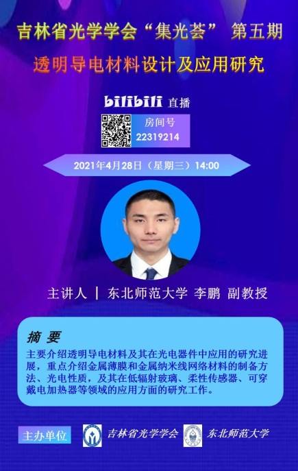 4月28日,吉林省光学学会“集光荟”第五期科普讲座顺利举办,本次活动邀请到专业委员会合作单位东北师范大学副教授李鹏做了主题为“透明导电材料设计及应用研究” 的科普报告。本次活动采取线上直播科普方式,让广大光学爱好者能够足不出户领略科技的魅力,探索科学的奥秘。