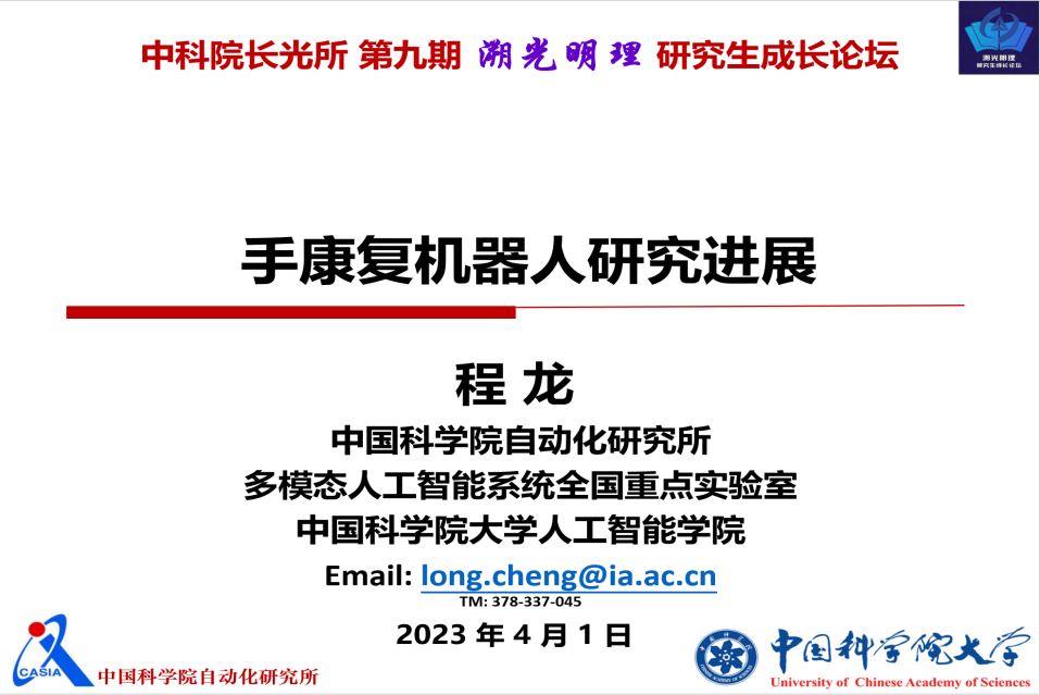 2023年4月1日,长春光机所“溯光明理”研究生成长论坛特邀中国科学院自动化研究所程龙研究员做线上学术报告,报告题目为《手康复机器人研究进展》。研究生部相关老师、在读研究生100余人共同聆听了本次报告。