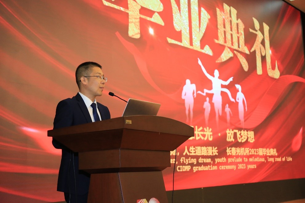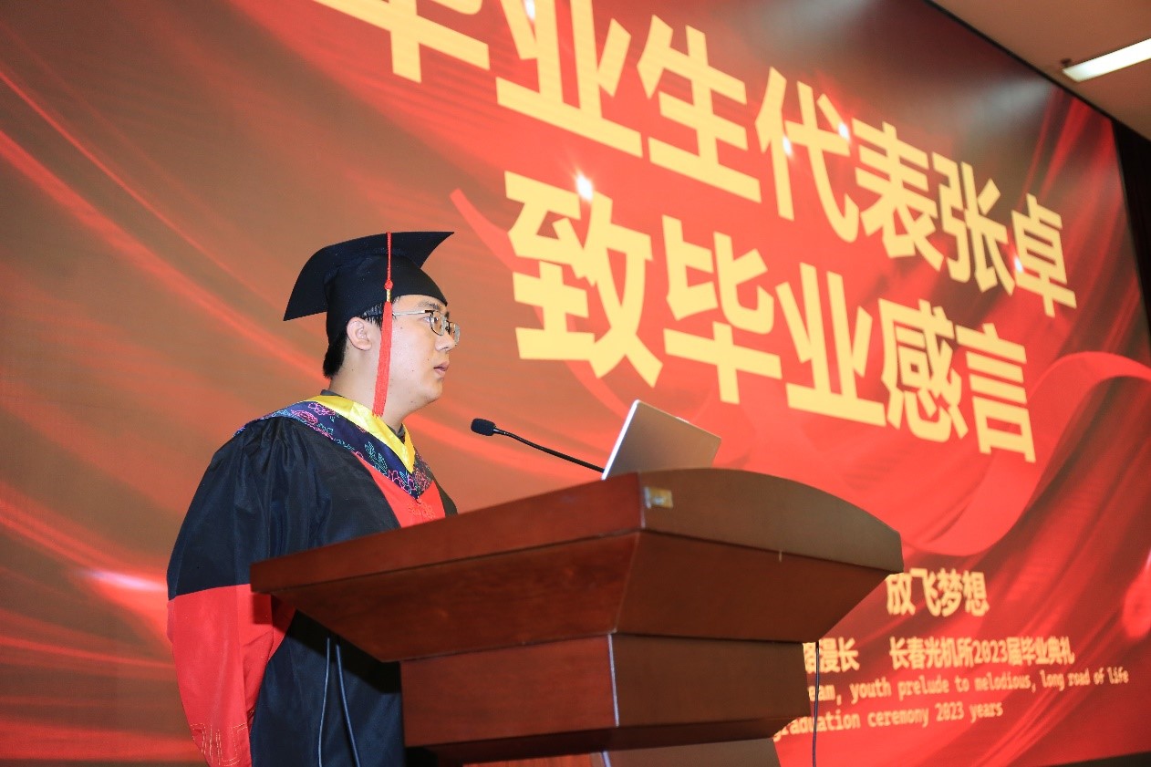 优秀毕业生代表张卓同学分享了他的成长感悟与心声。他表示在长春光机所求学的五年时光,是培养独立思考和解决问题能力的“蜕变期”;是不断坚定青年责任与担当意识的“成熟期”,更是不断探索、勇敢尝试的“试错期”。希望大家不负心中的赤诚与热爱,不负父母和师长的殷殷期望,在青春的赛道上奋力奔跑,创造出更加辉煌灿烂的人生。