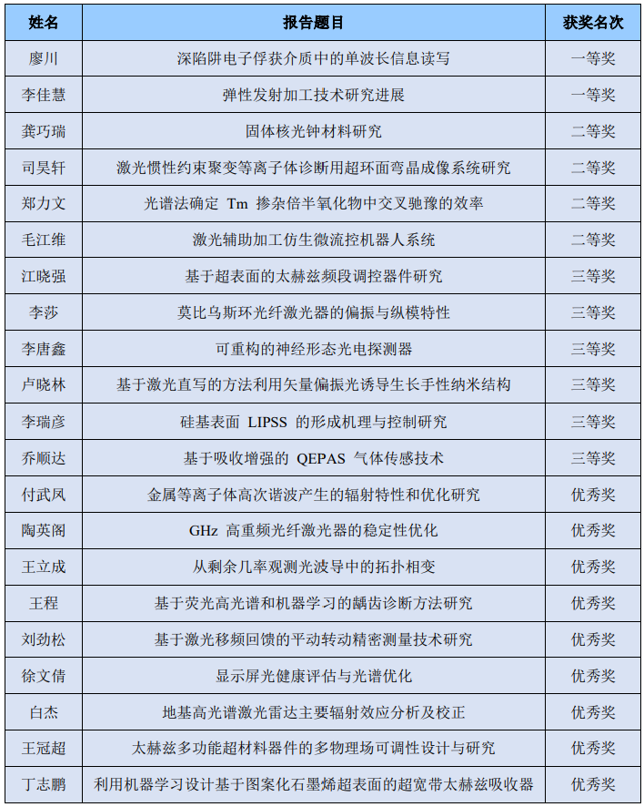 本届论坛以“光生万物 光联万物 ”为主题,共收到来自全国三十余所高校和科研院所同学的近百份投稿,最终有21份学术报告和17份海报入围,内容涵盖光通信、光纤传感、光学成像、光学测量、光信息处理、激光技术、光学器件制造、太赫兹技术、表面等离子体技术等领域的前沿技术和最新成果。学术报告由专家评委现场打分,从工作创新性、验证方法、发展前景、现场表现等方面对选手进行综合评价,并提出宝贵意见。