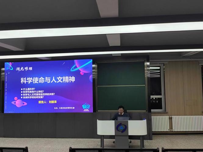 活动中,刘振泽用“什么是科学”这一问题引起参会研究生的兴趣,将神话的浪漫与科学的严谨相结合,碰撞出思想迸发的火花,并借此展开了一场别开生面的科学使命的阐述。刘振泽还向同学们介绍了科学究竟有什么特性,以及科学与人文精神的关联。最后,针对未来科学如何发展这一问题与大家一起展开了探讨交流。