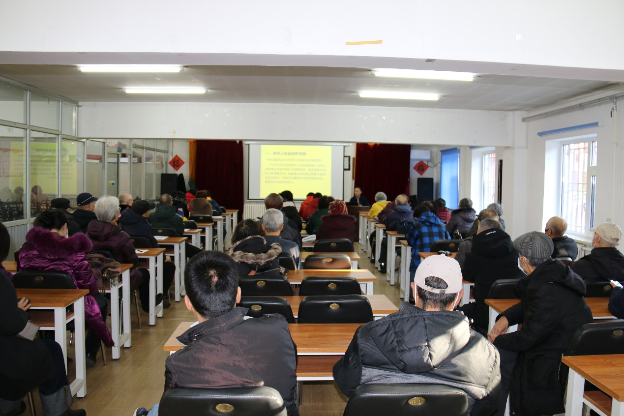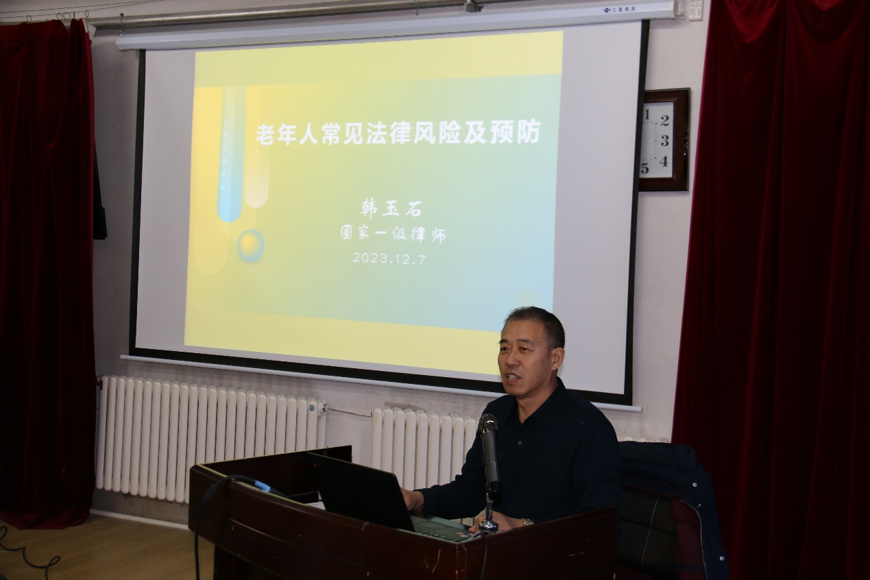 为进一步提高本所离退休老同志的法律意识,依法维护自身合法权益,12月7日上午,长春光机所离退中心邀请国家一级律师、长春光机所原法律顾问、北京冠衡长春律师所合同法律部部长韩玉石,做了题为《老年人常见法律风险及预防》的法律讲座。讲座由离退中心主任韩文斌主持,本所离退委委员、支部委员、片长、管理员及感兴趣的老同志,离退中心职工支部党员及工作人员50余人参加了活动。