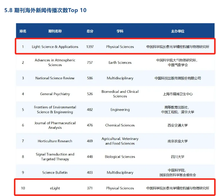 在“期刊海外新闻传播次数Top10”榜单中,《Light:Science&Applications》与《eLight》分别斩获第一名与第十名。