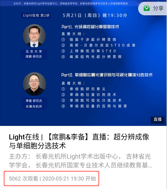 5月21日晚,由长春光机所Light学术出版中心、吉林省光学学会、长春光机所国家专业技术人员继续教育基地联合主办的第2次直播公开课——“超分辨成像与单细胞分选技术”在Light学术出版中心自运营品牌网络直播平台“Light在线”成功播出。