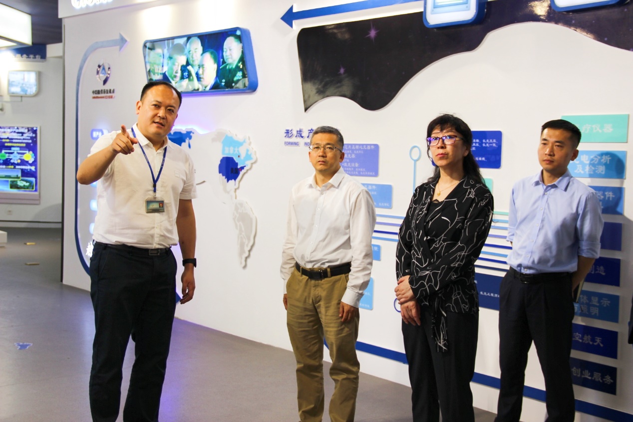 在长光产业展示中心,赵嵩介绍了孵化器依托长春光机所国际一流技术条件和人才优势,坚持高质量发展,通过集聚科研力量、加速科技成果转化、建设公共技术服务平台、培养和引进高层次人才、营造双创氛围等各方面取得的成果,并重点介绍了园区围绕航空航天信息、激光技术及应用、核心元器件与材料、智能制造与装备、半导体显示照明、人工智能、医疗与生命科学等七大产业领域打造产业集群的详细汇报。