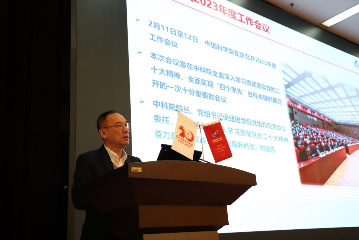 所长贾平作了题为《中国科学院2023年度工作会议精神传达及研究所后续工作部署》的报告。他指出,2023年度工作会议是在中科院全面深入学习贯彻落实党的二十大精神、全面实现“四个率先”目标关键时期召开的一次十分重要的会议。会议以习近平新时代中国特色社会主义思想为指导,深入学习贯彻党的二十大精神,准确把握全面建设社会主义现代化国家对科技创新提出的新部署新要求,总结2022年工作,明确未来一个时期中科院加快改革创新发展的总体思路,部署2023年重点工作。
