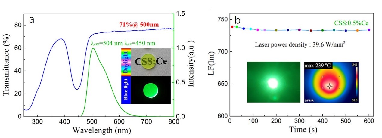 (a)CSS:Ce青绿荧光透明陶瓷的发射光谱,透过光谱和在日光和蓝光下的图片;(b)高密度蓝色激光激发下,流明通量随时间的稳定输出,高亮度青绿荧光图片,陶瓷片温度分布图,最高为239℃,耐热性能优良。
