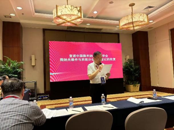 中国微米纳米技术学会微纳光器件与系统分会挂靠于中国科学院长春光学精密机械与物理研究所,是中国微米纳米技术学会下设专业分会之一。大会首先由吴一辉研究员介绍微纳光器件与系统分会前期筹办情况,她首先对筹备过程中王立鼎院士、尤政院士、蒋庄德院士等人的指导表示感谢,对与会领导与分会代表的支持表示感谢。随后刘冲代表学会宣读了中国微米纳米技术学会微纳光器件与系统分会成立登记的批复,随后与李铁共同向分会颁发了登记证书。