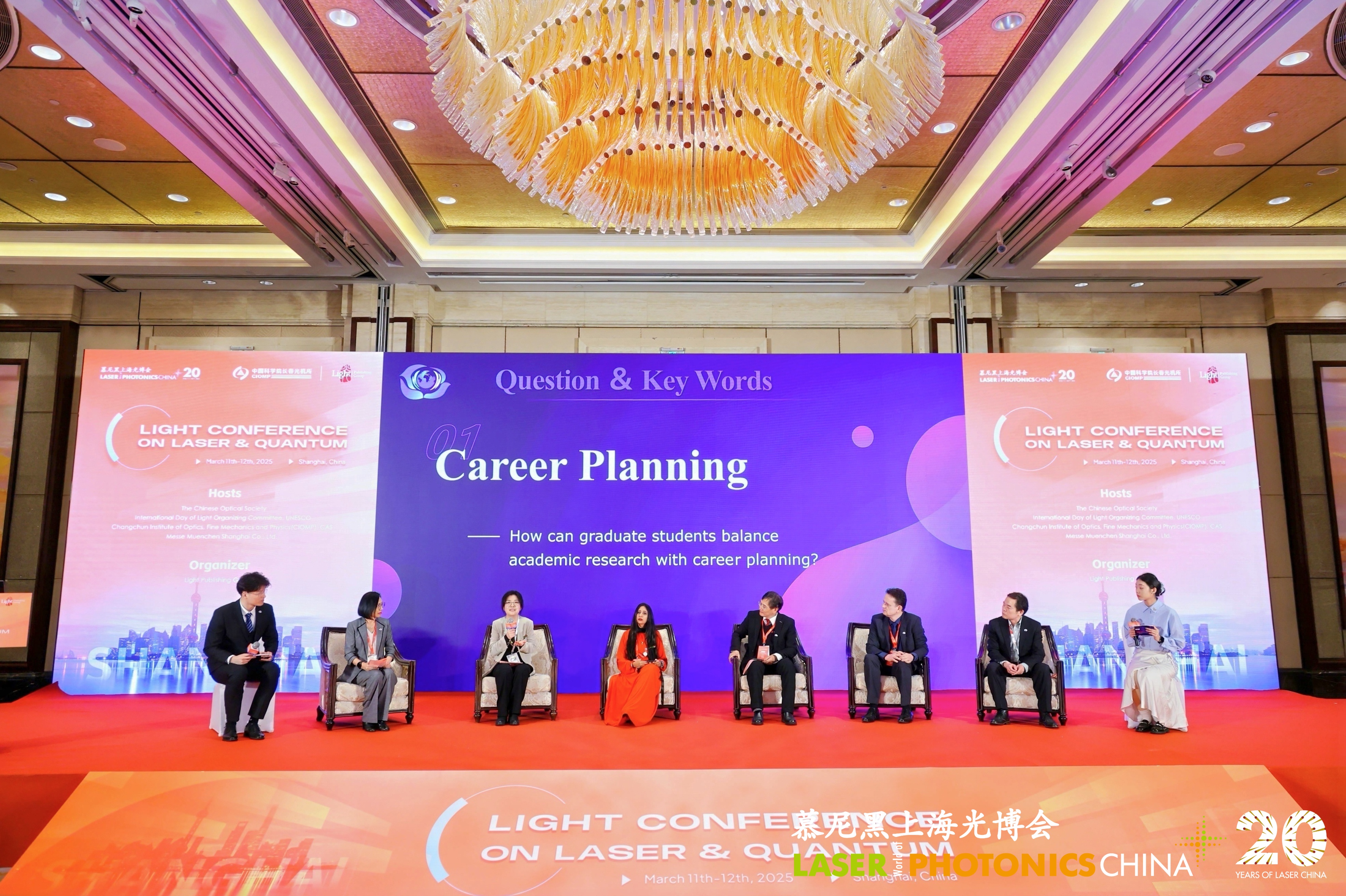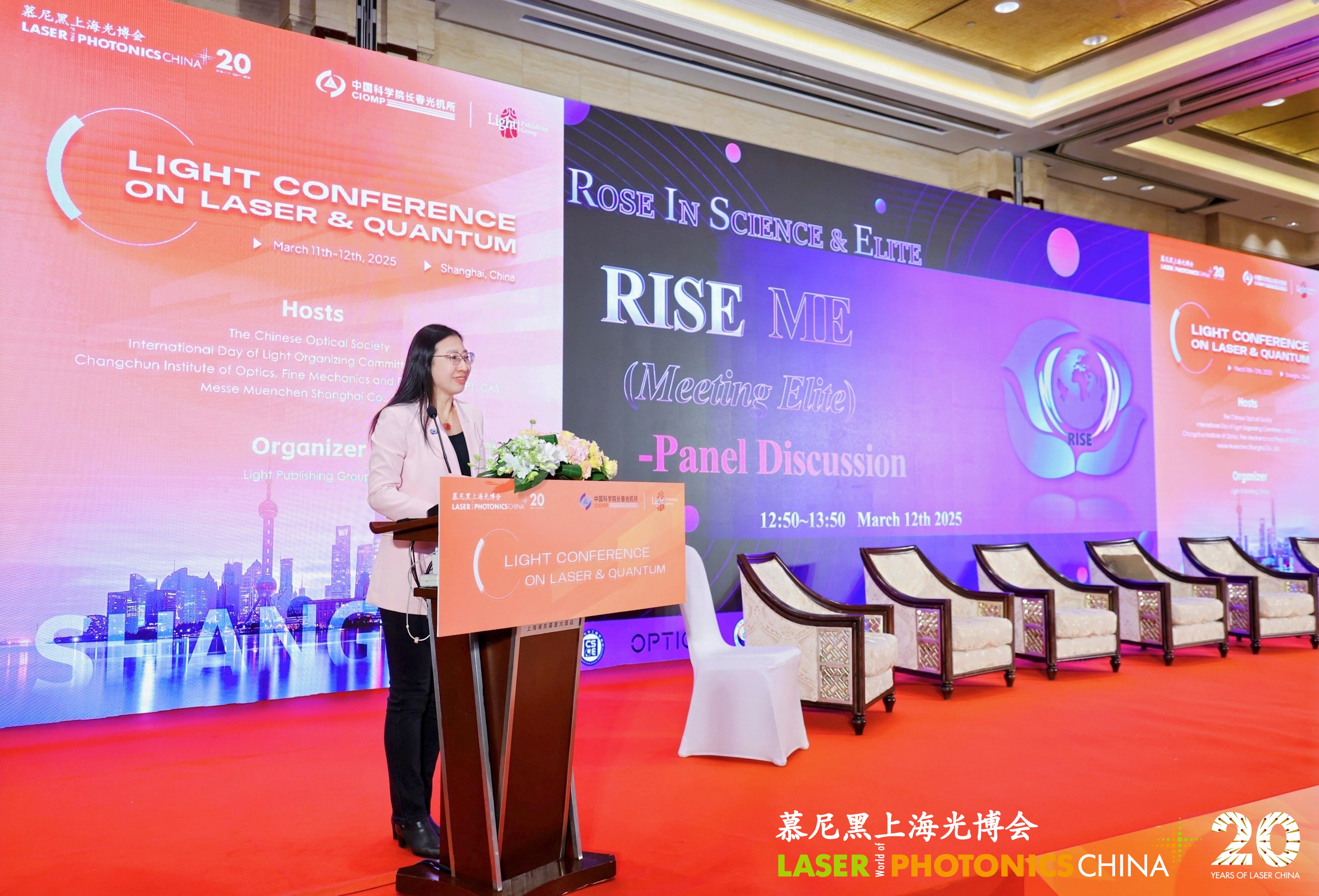 2025年3月12日,“Rose in Science & Elite”(RISE)系列活动之“Rose in Science & Elite——Meeting Elite 2025”(RISE ME 2025)在慕尼黑上海光博会作为Light Conference on Laser and Quantum特别活动成功举办。来自科研、产业、出版等各领域的精英齐聚一堂,与青年学子们共同探讨学术研究、产业发展与职业规划等热点话题。本次活动是RISE第一次在国际会议上以学生为主体筹备和组织的,会议由长春光机所研究生部博士生乔善同和黄安怡主持。活动邀请了《Light: Science & Applications》的创始人兼执行主编白雨虹、南非斯泰伦博斯大学Quphoton实验室负责人及联合国国际光学委员会(ICO)副主席Yaseera Ismail、厦门大学陈嘉庚讲座教授洪明辉、德国卡尔斯鲁厄理工学院(KIT)应用材料研究所激光材料加工研究组负责人Wilhelm Pfleging、复旦大学光科学与工程系助理教授王丹青、AdValue Photonics Inc.创始人兼董事长蒋仕彬以及RISE发起人王卉作为嘉宾。