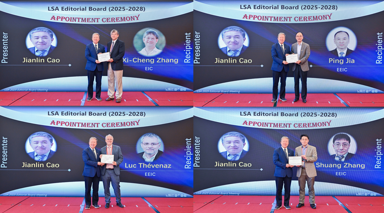大会期间,Light 2025年编委会暨2025-2028年度编委及Light全球办公室换届/聘任典礼成功召开。本次会议由中国科学院长春光机所副总师、研究员、Light执行主编白雨虹主持,来自十余个国家的40余位编委会成员、区域办公室负责人及编辑部成员与会共谋期刊发展蓝图。会议伊始,中国科学院长春分院分党组书记、院长、长春光机所党委书记金宏代表主办方致欢迎辞。他对期刊的发展表示了高度肯定,期刊创刊以来,年投稿量、发文量持续增长,影响力不断提升,这一切成果离不开全体编委会、全球区域办公室成员的卓越贡献。他表示未来将持续通过基础设施升级、开放获取计划及全球合作支持期刊建设,诚邀编委建言发展路径,并深化与长春光机所的创新合作。Light创刊主编曹健林和金宏书记分别为到场的新一届编委会成员及Light全球办公室负责人颁发了聘书,标志着新一届编委会正式成立。