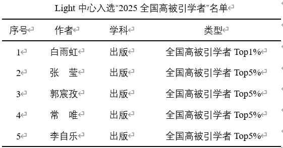 此外,Light中心共有3人连续2年入选“全国高被引学者”名单,其中,白雨虹研究员连续2年入选“全国高被引学者Top 1%”,张莹编审、郭宸孜编审连续2年入选“全国高被引学者Top 5%”。
