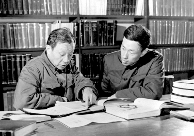 王大珩(左)与他的学生中国科学院长春光学精密机械研究所副研究员蒋筑英在研究工作(资料照片)。新华社发 |