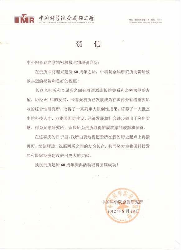 | 中国科学院金属研究所贺信 |