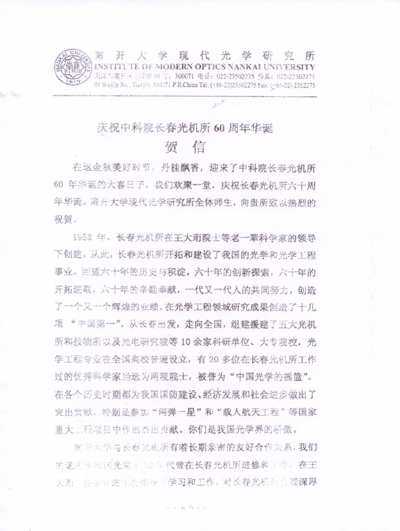 | 南开大学现代光学研究所贺信 |