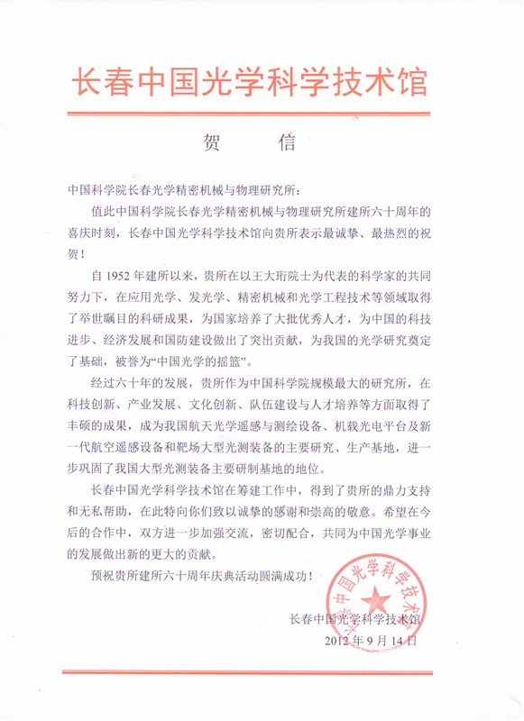 | 长春中国光学科技馆贺信 |