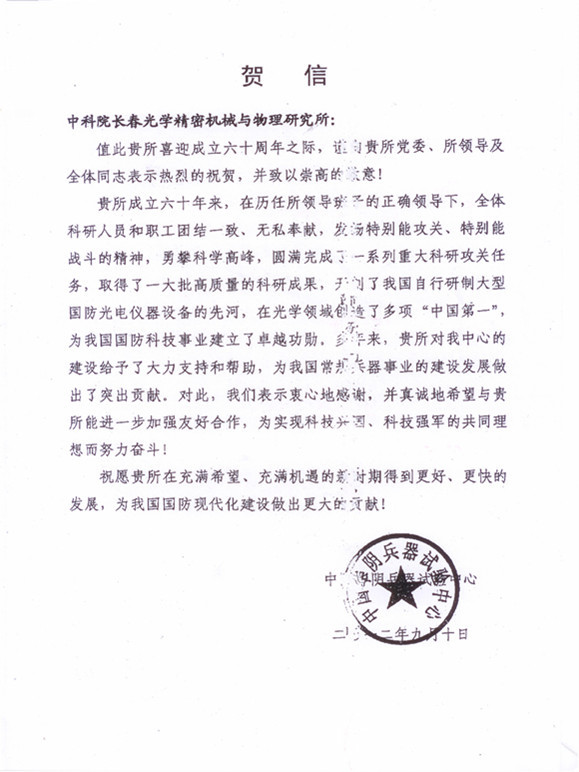 中国华阴兵器试验中心贺信