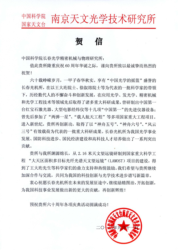 中国科学院南京天文光学技术研究所贺信